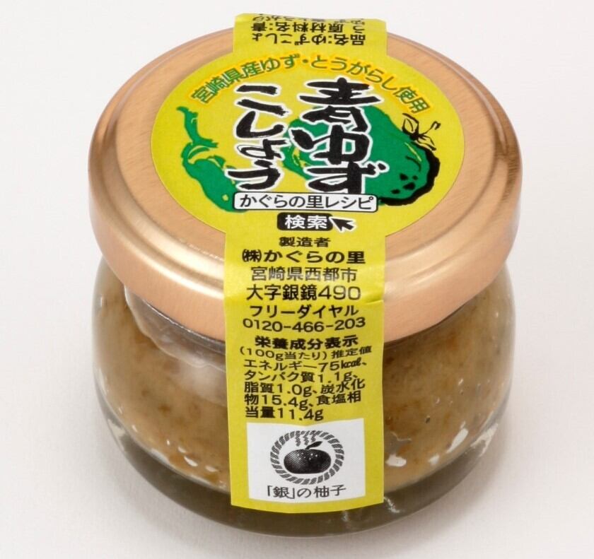 宮崎県産青ゆず・青とうがらしを使用し、塩分を控えめに仕上げました。粒が粗く、ゆずの香りをしっかりと楽しめます。