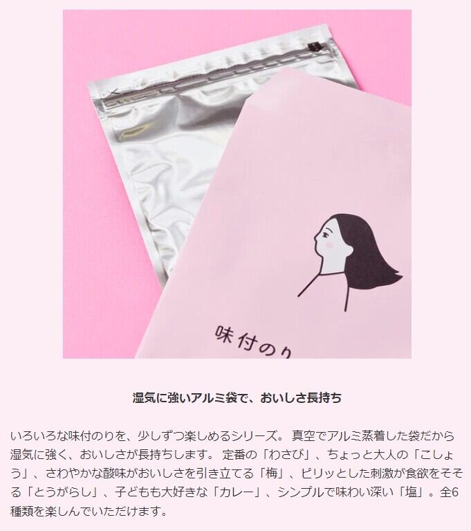 ●湿気に強いアルミ袋で、おいしさ長持ち:いろいろな味付のりを、少しずつ楽しめるシリーズ。 真空でアルミ蒸着した袋だから湿気に強く、おいしさが長持ちします。 定番の「わさび」、ちょっと大人の「こしょう」、さわやかな酸味がおいしさを引き立てる「梅」、ピリッとした刺激が食欲をそそる「とうがらし」、子どもも大好きな「カレー」、シンプルで味わい深い「塩」。全6種類を楽しんでいただけます。●おつまみのアクセントに:わさびのツンとした香りと、焼のりの香ばしさが、食材のよさをより引き立ててくれます。例えば、まぐろなどわさびに合わせた食材をなんでも乗せて。もちろん、そのままでも。●ネギトロのっけ:ツンとさわやかなわさび香る味付けのりに、細かく刻んだネギトロをサッと乗せれば、さくさくとした歯ざわりやあふれる旨みのハーモニーを味わえる大人の一品に。